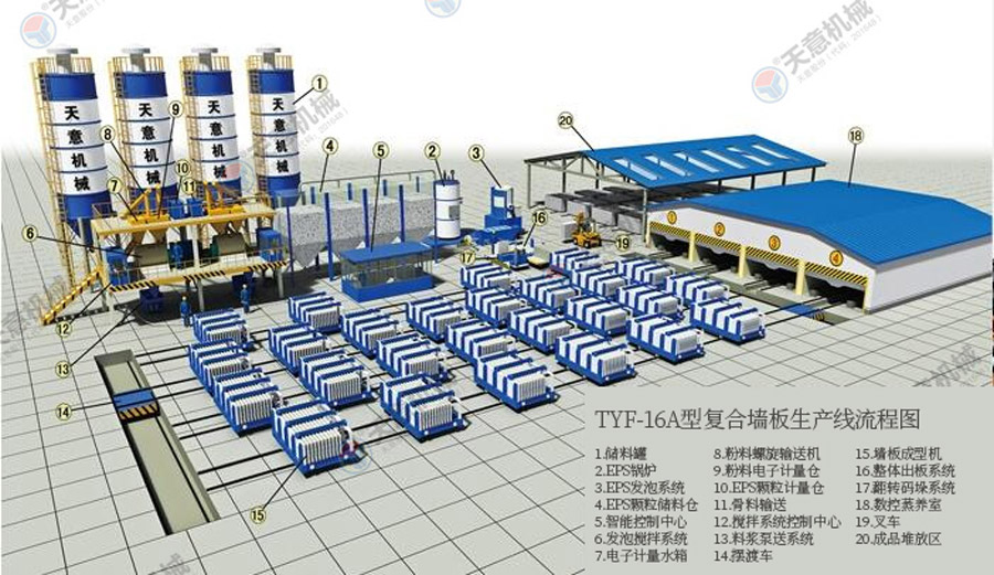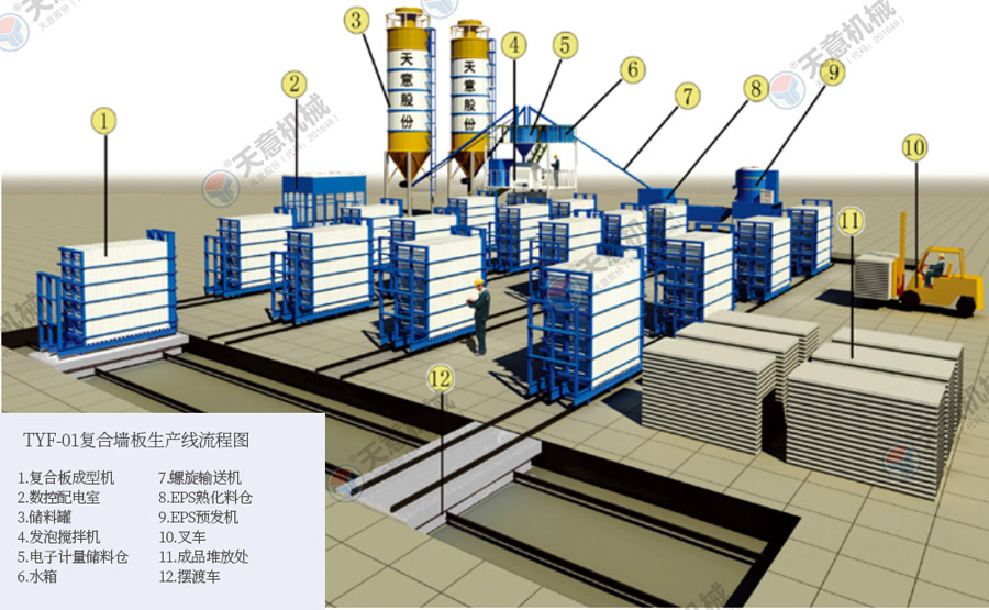TY12型墻板生產(chǎn)線包括:墻板成型機(jī)、整體穿抽管系統(tǒng)、發(fā)泡系統(tǒng)、水箱、電子計(jì)量?jī)?chǔ)料倉(cāng)、螺旋上料輸送機(jī)、儲(chǔ)料罐、螺旋輸送機(jī)、EPS熟化料倉(cāng)、硫化干燥床、EPS預(yù)發(fā)機(jī)、數(shù)控配電室、發(fā)泡攪拌機(jī)、整體出板系統(tǒng)、叉車、成品堆放區(qū)、擺渡車。