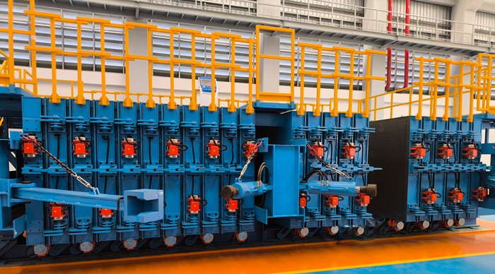 工作原理:模具的開(kāi)合由下方的液壓機(jī)構(gòu)完成,和墻板機(jī)類似。合模后的鎖緊由上方和兩端的拉桿裝置實(shí)現(xiàn)。下方的強(qiáng)制同步裝置保證了大板在開(kāi)合時(shí)的兩側(cè)同步。大板下方的輪組保證了大板在開(kāi)合時(shí)不傾斜、不倒伏。