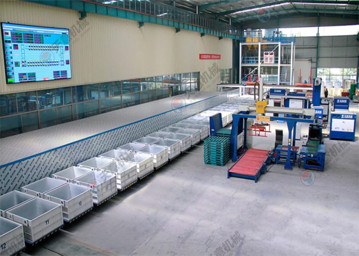 水泥發(fā)泡保溫板生產線是我公司順應市場需求新研發(fā)的成套設備。該生產線將工藝流程劃分為攪拌系統(tǒng)、循環(huán)澆注系統(tǒng)、脫模系統(tǒng)、切割系統(tǒng)、包裝系統(tǒng)、儲存系統(tǒng)、廢料破碎回收系統(tǒng),全套生產線可實現班產量400—600m3,全部利用自動控制生產流程,所需人工9—12人,大大降低生產成本.